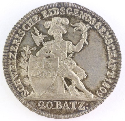 Rs.: In Strichelkreis Umschrift: «SCHWEIZERISCHE EIDSGENOSSENSCHAFT 1809». Sitzender Krieger nach rechts blickend in «altschweizerisch-vaterländischer Tracht» in Anlehnung an die Söldnerkleidung des 16. Jhs. mit geschlitzten Beinkleidern, geschlitztem Wams und Federhut (Freiheitshut, Symbol für die Freiheit), in der Linken einen Zweig haltend (Symbol für die neue politische Ordnung und Hoffnung), im angewinkelten rechten Arm eine Hellebarde, den rechten Unterarm auf einen spitzen Schild gelehnt, dieser links flankiert von einem Eichenzweig (Symbol der Stärke und Treue) und beschriftet mit «XIX / CANT :» (19 Kantone), darunter die Wertangabe «20 BATZ :».
