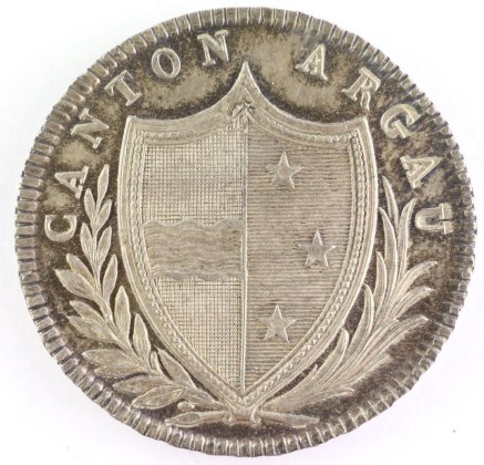 Vs.: In Strichelkreis Umschrift: «CANTON – AARGAU». Schild in Schweizer Form mit Aargauer Wappen zwischen Lorbeer- und Palmzweig (Symbole des Siegs und Ruhms sowie des Friedens).
