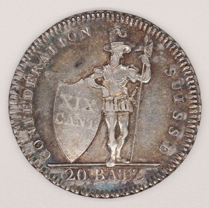 Rs.: In Strichelkreis Umschrift: «CONFÉDÉRATION – SUISSE». Auf Bodenleiste stehender, nach links blickender Krieger in «altschweizerisch-vaterländischer Tracht» in Anlehnung an die Söldnerkleidung des 16. Jhs. mit geschlitzten Beinkleidern, geschlitztem Wams und Federhut (Freiheitssymbol). In seiner Linken eine auf den Boden gestützte Hellebarde. Sein rechter Unterarm liegt auf der oberen Kante eines Schilds mit den Angaben «XIX / CANT :» (19 Kantone), darunter im Abschnitt die Wertangabe «20 BATZ».