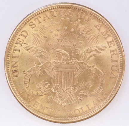 Die US-amerikanischen Goldmünzen, die ab 1795 geprägt wurden, zeigen auf der Rückseite alle einen Adler, weshalb sie die Bezeichnung «Eagle» erhielten, wobei die 10-Dollar-Münze einem Eagle entsprach. Folglich galt das 20-Dollar-Stück, wie das vorliegende Exemplar, als Double Eagle. Es wurde bis 1929 geprägt und war wie alle US-amerikanischen Goldmünzen bis 1933/34 im Umlauf. Die 13 Sterne sowohl auf der Vorder- wie Rückseite sowie die 13 vertikalen Streifen im Wappen auf der Rückseite stehen für die 13 ursprünglich englischen Kolonien Virginia, New Hampshire, Rhode Island, Massachusetts, Maryland, Connecticut, North Carolina, South Carolina, Delaware, New Yersey, New York, Pennsylvania und Georgia. Diese Staaten erklärten 1776 ihre Unabhängigkeit von England und riefen die Gründung der Vereinigten Staaten von Amerika (USA) aus. Auch der Wahlspruch «e pluribus unum» weist auf den Entstehungsakt der USA hin, den Zusammenschluss der 13 Kolonien zu einem souveränen Staat.