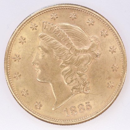 Vs.: Umschrift: In Perl- und Linienkreis weiblicher Kopf nach links, Profil nach dem griechischen Ideal mit Stirn- und Nasenbein in gerader Linie und kleinem gerundeten Kinn, mit an oberer Kante mit Perlen besetztem Diadem mit Inschrift «LIBERTY» (Allegorie der Freiheit), umgeben von 13 Sternen, darunter «1885».