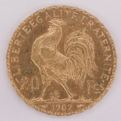 Rs.: Umschrift: «LIBERTE . EGALITE . FRATERNITE .» (Freiheit, Gleichheit, Brüderlichkeit). In Randeinfassung aus Eierstab mit dazwischenliegenden Blättern der Gallische Hahn nach links, auf Wiese mit Blume und Grassbüschel, der Hahn zwischen «20 – Fcs», im Abschnitt: «(Fackel) 1902 (Füllhorn)». (Fackel = Zeichen von Henri-Auguste-Jules Patey, Münzgraveur der Pariser Münzstätte (1896–1930), Füllhorn = seit 1880 nicht mehr individuelles Zeichen der einzelnen Direktoren der Münzstätte, sondern allgemein der Régie de Monnaies/Leitung der Münzstätte).