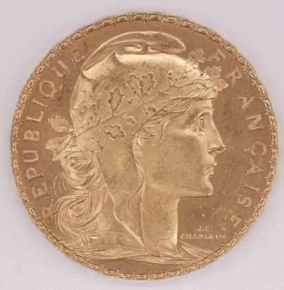 Münze: 20-Francs-Stück der Republik Frankreich, geprägt in Paris, aus dem Nachlass von Karl Asmund Kappeler (1844–1924), Kaufmann in Kolumbien