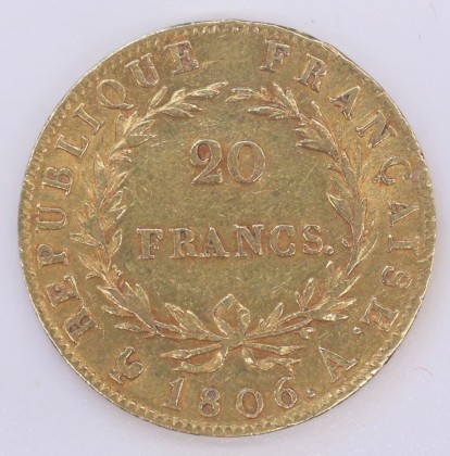 Rs.: Umschrift: «REPUBLIQUE FRANÇAISE .». In Kerbschnittkreis zweizeilige Angaben in unten mit Schleifen gebundenem Lorbeerkranz (Symbol des Siegs und Ruhms): «20 / FRANCS .», darunter «(Hahn) 1806 . A». (Hahn = Zeichen von Charles-Pierre de l'Espine, Münzmeister der Pariser Münzstätte (1797–1821), A = Zeichen der Münzstätte Paris).