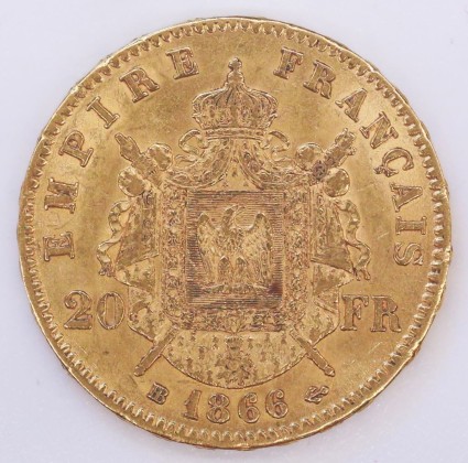 Rs.: Umschrift: «EMPIRE – FRANÇAIS». In Gerstenkorn- und Linienkreis Wappenschild mit dem nach rechts blickenden napoleonischen Adler, der mit gespreizten Fängen auf einem Blitzbündel (Donnerkeil) steht und seine Flügel ausgebreitet hat. Schild gerahmt von der Collane des Ordens der Ehrenlegion mit abgehängtem fünfzackigem Stern und auf drapiertem, mit Bügelkrone (mit Kreuz auf Reichsapfel auf Scheitelpunkt) bekröntem Hermelinmantel, dieser auf gekreuzten Zeptern (Symbol für die weltliche Herrschaft), das rechte Zepter bekrönt mit der Darstellung von Kaiser Karl dem Grossen, thronend mit Krone, Zepter und Reichsapfel, das linke Zepter mit Schwurhand (Symbol für die Gerechtigkeit, «main de justice»). Zwischen «20 – FR», darunter «BB[ligiert] 1866 (Anker)». (BB = Zeichen der Strasbourger Münzstätte, Anker = Zeichen des Generalgraveurs Désiré-Albert Barre (1855–1878)). Über dem Wappenschild drei Bienen. Links und rechts der Krone fallen entlang des Mantels gekräuselte Infuln herunter (Sinnbild der weltlichen und geistlichen Macht).