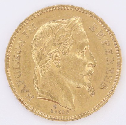 Münze: 20-Francs-Stück des Kaiserreichs Frankreich, geprägt in Strassburg zur Zeit von Kaiser Napoléon III. (1852–1870), aus dem Nachlass von Karl Asmund Kappeler (1844–1924), Kaufmann in Kolumbien