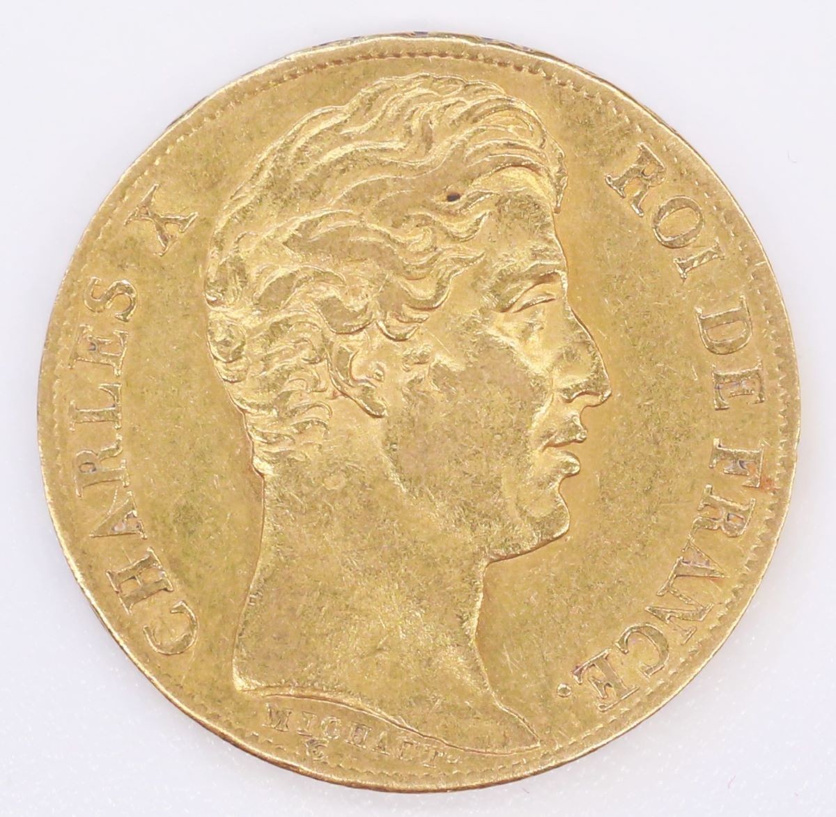 Vs.: Umschrift: «CHARLES X – ROI DE FRANCE .». In Lilien- und Perlkreis Kopfporträt des Königs mit längeren, nach vorne gekämmten Haaren (in Anlehnung an den damals modischen Tituskopf), nach rechts, darunter Name des Medailleurs «MICHAUT . / kursiv «T» (Nicolas-Pierre Tiolier, Graveur der Pariser Münzstätte (1824–1830).