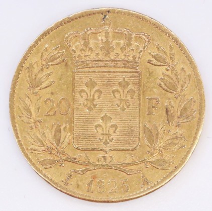 Rs.: In Linien- und Perlkreis mit Lilienkrone bekrönter Schild mit Wappen der Bourbonen mit drei Lilien, zwischen «20 – F» und Lorbeerzweigen (Symbol des Siegs und Ruhms), darunter «(Anker) 1825 A» (Anker = Zeichen von Jean-Pierre Collot, Münzmeister der Pariser Münzstätte (1821–1842), A = Zeichen der Pariser Münzstätte).