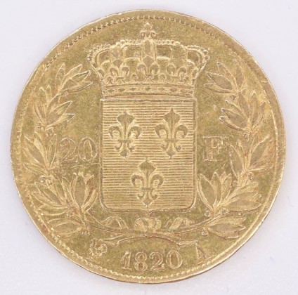 Rs.: In Linien- und Perlkreis mit Lilienkrone bekrönter Schild mit Wappen der Bourbonen mit drei Lilien, zwischen «20 – F» und Lorbeerzweigen (Symbol des Siegs und Ruhms), darunter «(Anker) 1820 A» (Anker = Zeichen von Jean-Pierre Collot, Münzmeister der Pariser Münzstätte (1821–1842), A = Zeichen der Pariser Münzstätte).