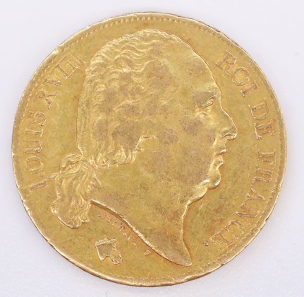 Münze: 20-Francs-Stück des Königreichs Frankreich, geprägt in Paris zur Zeit von König Ludwig XVIII. (1814–1824), aus dem Nachlass von Karl Asmund Kappeler (1844–1924), Kaufmann in Kolumbien