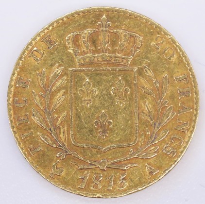 Rs.: «Umschrift: "PIECE DE – 20 FRANCS». In Wellenkreis mit Lilienkrone bekrönter Schild mit Wappen der Bourbonen mit drei Lilien zwischen Lorbeerzweigen (Symbol des Siegs und Ruhms), darunter «(Hahn) 1815 A» (Hahn = Zeichen von Charles-Pierre de l'Espine, Münzmeister der Pariser Münzstätte (1797–1821), A = Zeichen der Pariser Münzstätte).
