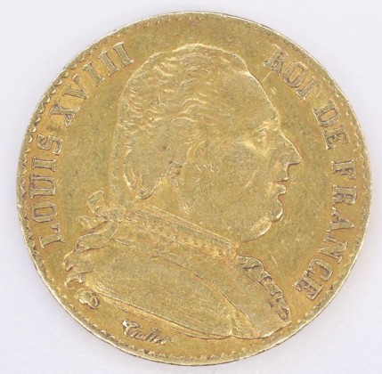 Münze: 20-Francs-Stück des Königreichs Frankreich, geprägt in Paris zur Zeit von König Ludwig XVIII. (1814–1824), aus dem Nachlass von Karl Asmund Kappeler (1844–1924), Kaufmann in Kolumbien