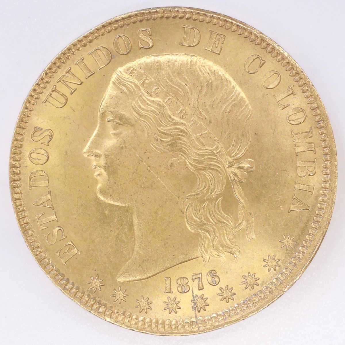 Vs.: Umschrift: «ESTADOS UNIDOS DE COLOMBIA» (Vereinigte Staaten von Kolumbien). In Perl- und Linienkreis Frauenbüste mit am Hinterkopf mit Schleife gebundenem Haarband mit Inschrift «LIBERTAD» (Allegorie der Freiheit), nach links, darunter «1876», neun im Bogen angeordnete Sterne für die neun Bundesstaaten Kolumbiens.