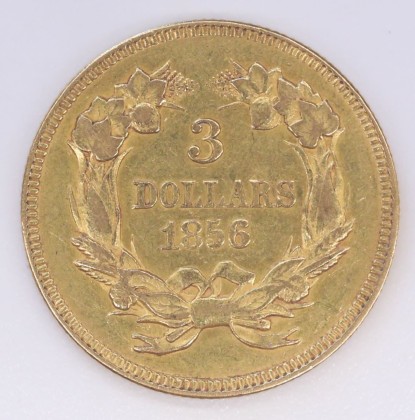 Rs.: In Strichel- und Linienkreis die Angaben «3 / DOLLARS / 1856» in unten mit Band mit Schleife gebundenem Kranz aus Weizenähren und Maiskolben (Repräsentanten der Nordstaaten der USA) sowie Blättern mit geschlossenen Fruchtkapseln der Baumwollpflanze und Blättern und Blüten der Tabakpflanze (Repräsentanten der Südstaaten der USA).