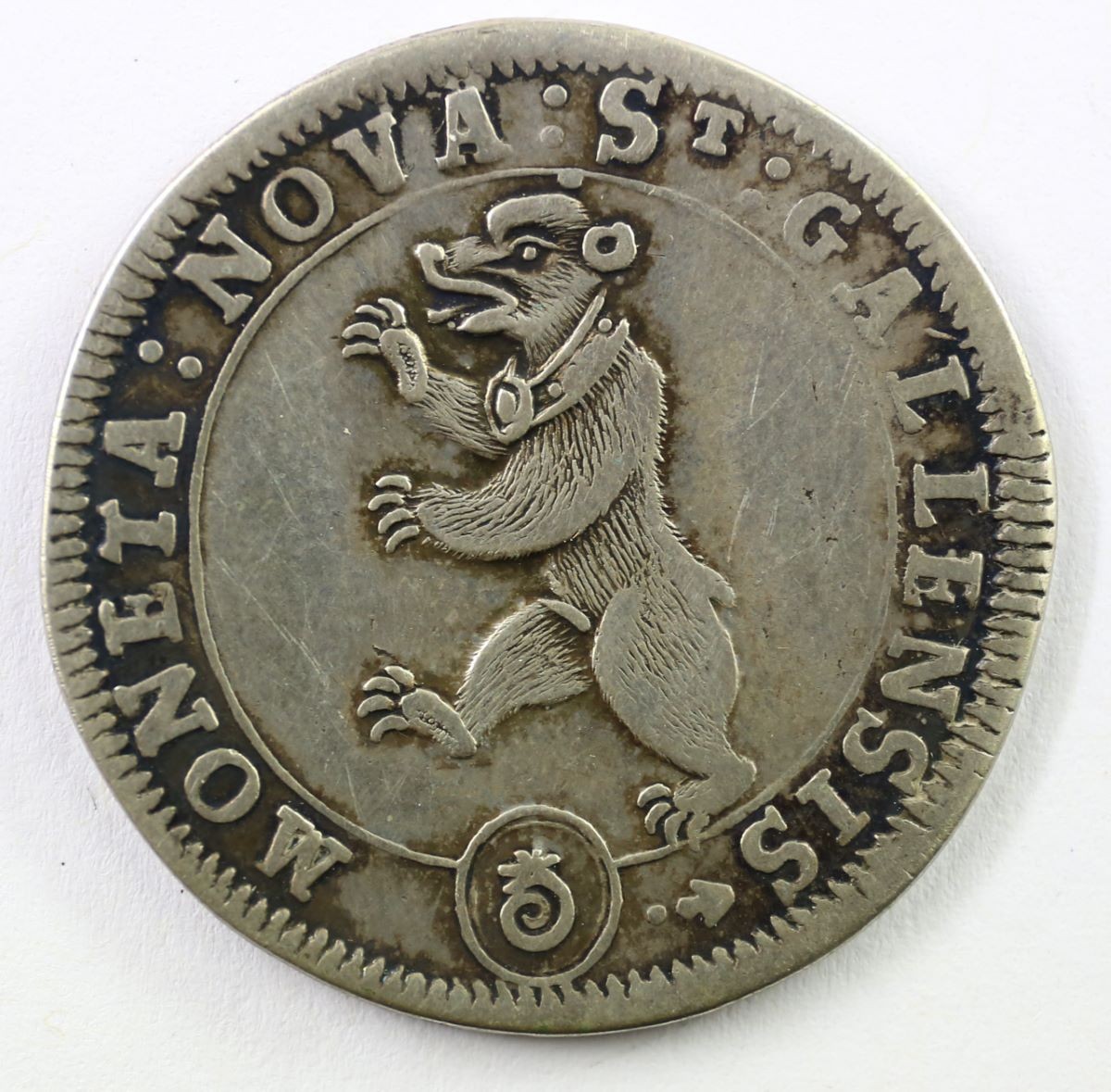 Vs.: In Strichelkreis Umschrift: «MONETA : NOVA : ST[T hochgestellt] : GALLENSIS (Lilienblüte und ein Punkt)» (MONETA NOVA SANGALLENSIS, neue Münze der Stadt St. Gallen). In Linienkreis ein aufrecht stehender und heraldisch nach rechts schreitender Bär mit Halsband, darunter Münzmeisterzeichen in Form einer gerollten Schlange in Oval.