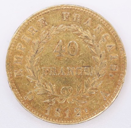 Rs.: Umschrift: «EMPIRE FRANÇAIS (Raute)». In Linien- und Perlkreis zweizeilige Angaben in unten mit Schleifen gebundenem Lorbeerkranz: «40 / FRANCS (Raute)», darunter «(Hahn) 1812 (Raute) A». (Hahn = Zeichen von Charles-Pierre de l'Espine, Münzmeister der Pariser Münzstätte (1797–1821), A = Zeichen der Münzstätte Paris).