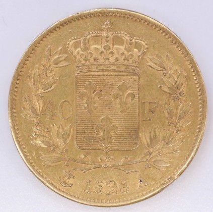 Rs.: In Linien- und Perlkreis mit Lilienkrone bekrönter Schild mit Wappen der Bourbonen mit drei Lilien, zwischen «40 – F» und Lorbeerzweigen (Symbol des Siegs und Ruhms), darunter «(Anker) 1828 A» (Anker = Zeichen von Jean-Pierre Collot, Münzmeister der Pariser Münzstätte (1821–1842), A = Zeichen der Pariser Münzstätte).