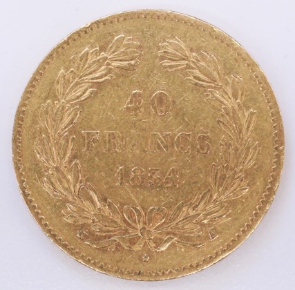 Rs.: In Linien- und Zahnschnittkreis dreizeilige Angabe: «40 / FRANCS / 1834» in unten mit Schleifen gebundenem Lorbeer- und Eichenkranz (Symbole des Siegs und Ruhms sowie der Stärke, Treue und Einheit), darunter «(Anker) – (fünfzackiger Stern) – A» (Anker = Zeichen von Jean-Pierre Collot, Münzmeister der Pariser Münzstätte (1821–1842), fünfzackiger Stern = Zeichen von Nicolas-Pierre Tiolier, Graveur der Pariser Münzstätte (1830–1842), A = Zeichen der Pariser Münzstätte).