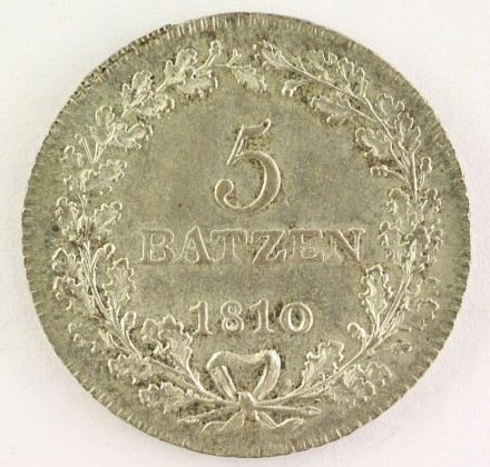 Rs.: In Strichelkreis Kranz aus zwei Eichenzweigen (Symbol der Stärke, Treue und Einheit), darin die Angaben: «5 / BATZEN / 1810». Unten mit Schleife gebunden.