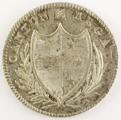 Vs.: In Strichelkreis Umschrift: «CANTON (Rosette) AARGAU». Aargauer Wappen in Schild in Schweizerform, zwischen Lorbeer- (Symbol des Siegs und Ruhms) und Palmzweig (Symbole des Friedens und Siegs).