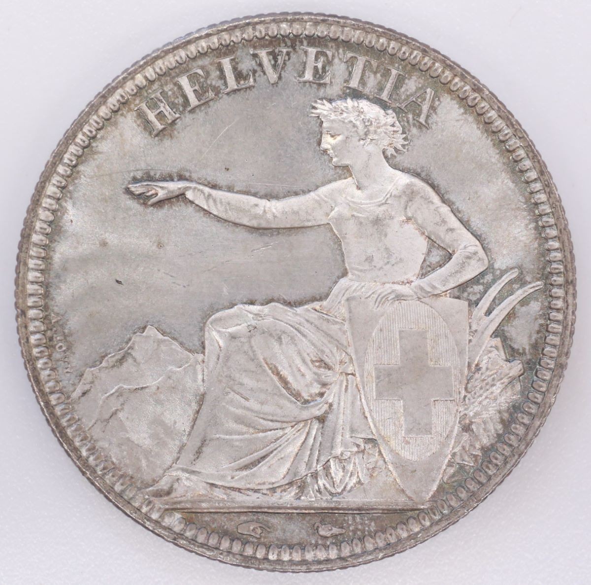 Vs.: Umschrift: «HELVETIA». In Perl- und Linienkreis sitzende Helvetia nach links (allegorische Figur, welche die Schweiz repräsentiert und Unabhängigkeit, Freiheit, Neutralität und Einigkeit verkörpert), die Linke auf den spatenförmigen Schild mit dem hochovalen Schweizer Wappen gelegt, die Rechte über das Alpenpanorama im Hintergrund ausstreckend. Hinter der Allegorie Sterzen des Pflugs und drei Ähren, vermutlich Weizen da ohne Grannen (Symbole der Prosperität). Links am Rand, oberhalb der Bergkulisse Name des Stempelschneiders im Gegenuhrzeigersinn «A. Bovy». Im Abschnitt Hand und Windhundkopf (Hand = Zeichen des Direktors der Pariser Münzstätte Charles-Louis Dierickx (1845–1860), Windhundkopf = Zeichen des Generalgraveurs Jean-Jacques Barre (1843–1855).