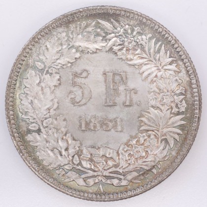 Rs.: In Perl- und Linienkreis die Angaben «5 Fr. / 1851» in einem unten mit Schleifen gebundenem Kranz aus Alpenrosen (Alpenblume, Symbol für die Alpen bzw. die Schweiz als Alpenland) und Eichenzweigen (Symbol der Stärke, Treue und Einheit). Darunter «A», das Zeichen der Münzstätte Paris.