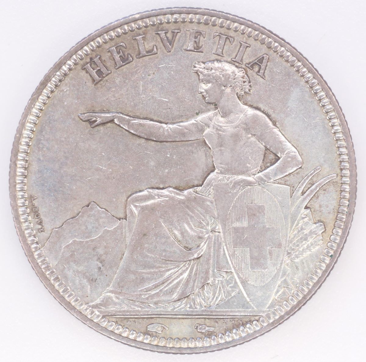 Vs.: Umschrift: «HELVETIA». In Perl- und Linienkreis sitzende Helvetia nach links (allegorische Figur, welche die Schweiz repräsentiert und Unabhängigkeit, Freiheit, Neutralität und Einigkeit verkörpert), die Linke auf den spatenförmigen Schild mit dem hochovalen Schweizer Wappen gelegt, die Rechte über das Alpenpanorama im Hintergrund ausstreckend. Hinter der Allegorie Sterzen des Pflugs und drei Ähren, vermutlich Weizen da ohne Grannen (Symbole der Prosperität). Links am Rand, oberhalb der Bergkulisse Name des Stempelschneiders im Gegenuhrzeigersinn «A. Bovy». Im Abschnitt Hand und Windhundkopf (Hand = Zeichen des Direktors der Pariser Münzstätte Charles-Louis Dierickx (1845–1860), Windhundkopf = Zeichen des Generalgraveurs Jean-Jacques Barre (1843–1855).