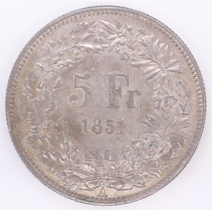 Rs.: In Perl- und Linienkreis die Angaben «5 Fr. / 1851» in einem unten mit Schleifen gebundenem Kranz aus Alpenrosen (Alpenblume, Symbol für die Alpen bzw. die Schweiz als Alpenland) und Eichenzweigen (Symbol der Stärke, Treue und Einheit). Darunter «A», das Zeichen der Münzstätte Paris.