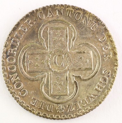 Rs.: Umschrift: «(Rosette) DIE CONCORDIER . CANTONE DER SCHWEIZ». In Bogenfries grosses, von einem Vierpass umgebenes Konkordatskreuz bzw. Schweizer Kreuz mit einem «C» in der Mitte, umgeben von Kranz aus Eichenblättern (Symbol der Stärke). Auf den Kreuzarmen je ein Vierpass mit je dreiblättrigem Kleeblatt in den Schnittpunkten.