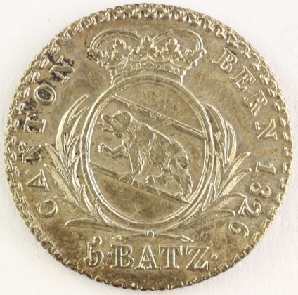 Vs.: Umschrift: «CANTON – BERN 1826». In Bogenfries mit Lilienkrone bekröntes ovales Berner Wappen (heraldisch nach rechts aufwärtsschreitender Bär mit erhobener linker Vordertatze), zwischen Palmzweigen (Symbole des Siegs und Ruhms), im Abschnitt die Angaben «5 . BATZ .».