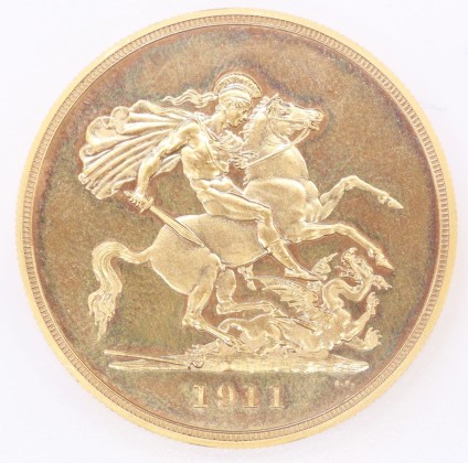 Rs.: In Perl- und Linienkreis reitender hl. Georg (Schutzpatron von England) nach rechts, den am Boden liegenden Drachen bekämpfend (Sinnbild vom Triumph des Guten über das Böse), darunter «1911» und «B . P .», (Benedetto Pistrucci).