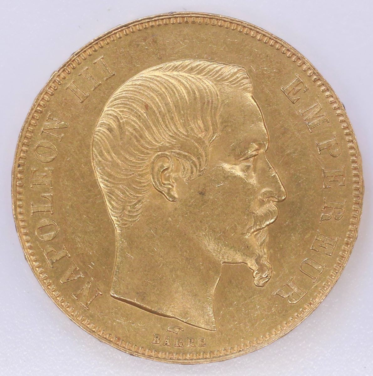 Vs.: Umschrift: «NAPOLEON III – EMPEREUR». In Linien- und Gerstenkornkreis Kopfporträt mit Knebelbart nach rechts, darunter «(Hand) / BARRE». (Hand = Zeichen des Direktors der Pariser Münzstätte Charles-Louis Dierickx (1845–1860), BARRE = Medailleur Jean-Jacques Barre (1793–1855)).