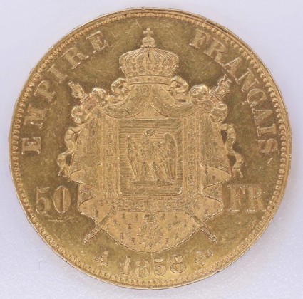 Rs.: Umschrift: «EMPIRE – FRANÇAIS». In Linien- und Gerstenkornkreis Wappenschild mit dem nach rechts blickenden napoleonischen Adler, der mit gespreizten Fängen auf einem Blitzbündel (Donnerkeil) steht und seine Flügel ausgebreitet hat. Schild gerahmt von der Collane des Ordens der Ehrenlegion mit abgehängtem fünfzackigem Stern und auf drapiertem, mit Bügelkrone (mit Kreuz auf Reichsapfel auf Scheitelpunkt) bekröntem Hermelinmantel, dieser auf gekreuzten Zeptern (Symbol für die weltliche Herrschaft), das rechte Zepter bekrönt mit der Darstellung von Kaiser Karl dem Grossen, thronend mit Krone, Zepter und Reichsapfel, das linke Zepter mit Schwurhand (Symbol für die Gerechtigkeit, «main de justice»). Zwischen «50 – FR», darunter «A 1858 (Anker)». (A = Zeichen der Pariser Münzstätte, Anker = Zeichen des Generalgraveurs Désiré-Albert Barre (1855–1878)). Über dem Wappenschild drei Bienen. Links und rechts der Krone fallen entlang des Mantels gekräuselte Infuln herunter (Sinnbild der weltlichen und geistlichen Macht).