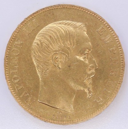 Münze: 50-Francs-Stück des Kaiserreichs Frankreich, geprägt in Paris zur Zeit von Kaiser Napoléon III. (1852–1870), aus dem Nachlass von Karl Asmund Kappeler (1844–1924), Kaufmann in Kolumbien