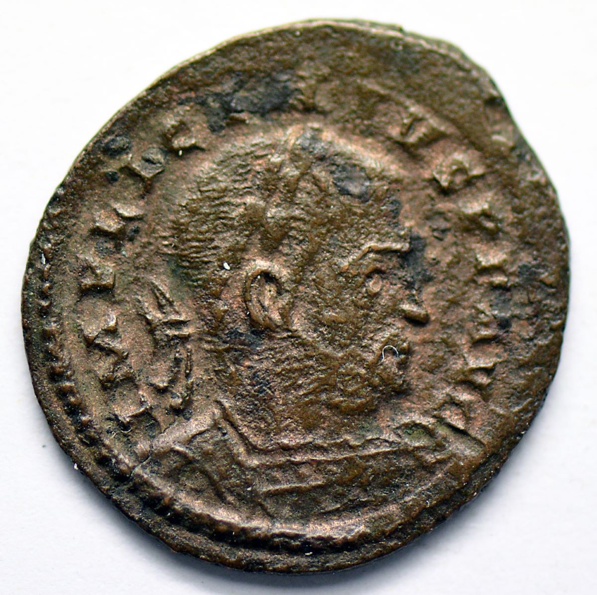 Vs.: Umschrift: «IMP LICINIVS P F AVG» (Imperator Licinius Pius Felix Augustus). In Perlkreis Kopfporträt von Kaiser Licinius mit Kürass und Lorbeerkranz (Symbol des Siegs und Ruhms), nach rechts.