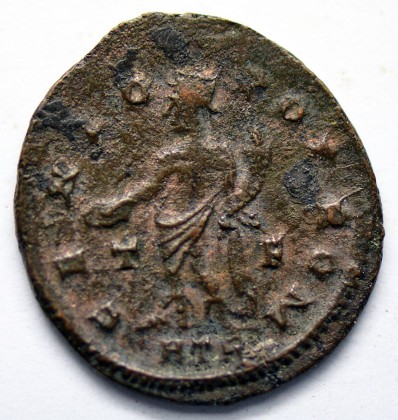 Unter dem Genius des römischen Volks ist das Kürzel «ATR» angegeben, womit die 1. Werkstatt (= A) der Münzstätte Treveri (= TR) als Produktionsstätte der Prägung angezeigt wird. Wichtige Münzstätten, wie Treveri, führten mehrere Werkstätten, die gleichzeitig aus dem ihnen zugewiesenen Metall Münzen prägten. Das Kürzel «T = F» bezieht sich auf eine bestimmte Emission. Dank dieser Emissionskürzel ist es in der Regel möglich, die Münzen exakt zu datieren.