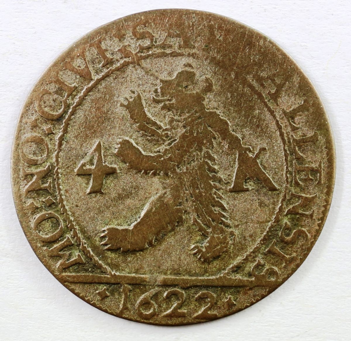 Vs.: In Strichelkreis Umschrift: «MO : NO : CIVI : SANGALLENSIS» (MONETA NOVA CIVITATIS SANGALLENSIS, neue Münze der Stadt St. Gallen). In Schnurkreis ein aufrecht stehender und heraldisch nach rechts schreitender Bär mit Halsband, flankiert von der Wertangabe «4 – K» (4 Kreuzer), im Abschnitt die Jahreszahl «1622».
