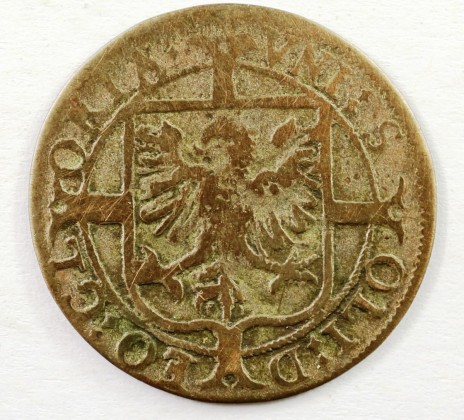 Rs.: In Strichelkreis Umschrift: «VNI : S – OLI : D – EO : GL - ORIA :» (Allein dem einzigen Gott [gebührt] die Ehre). In Schnurkreis Ankerkreuz mit blattförmigen Enden, die Kreuzarme am Wappenschild mit dem Reichsadler ansetzend.