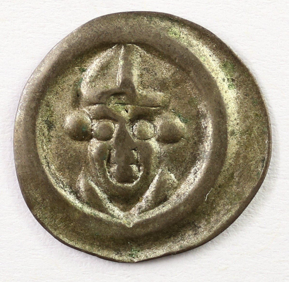 Vs.: In Wulstkreis Kopf des hl. Leodegar als Bischof mit Mitra (Kopfbedeckung von Bischöfen und ab Mitte des 12. Jhs. von bestimmten Äbten mit Rechts- und Verwaltungshoheit), auf Höhe der Stirn je eine Kugel.