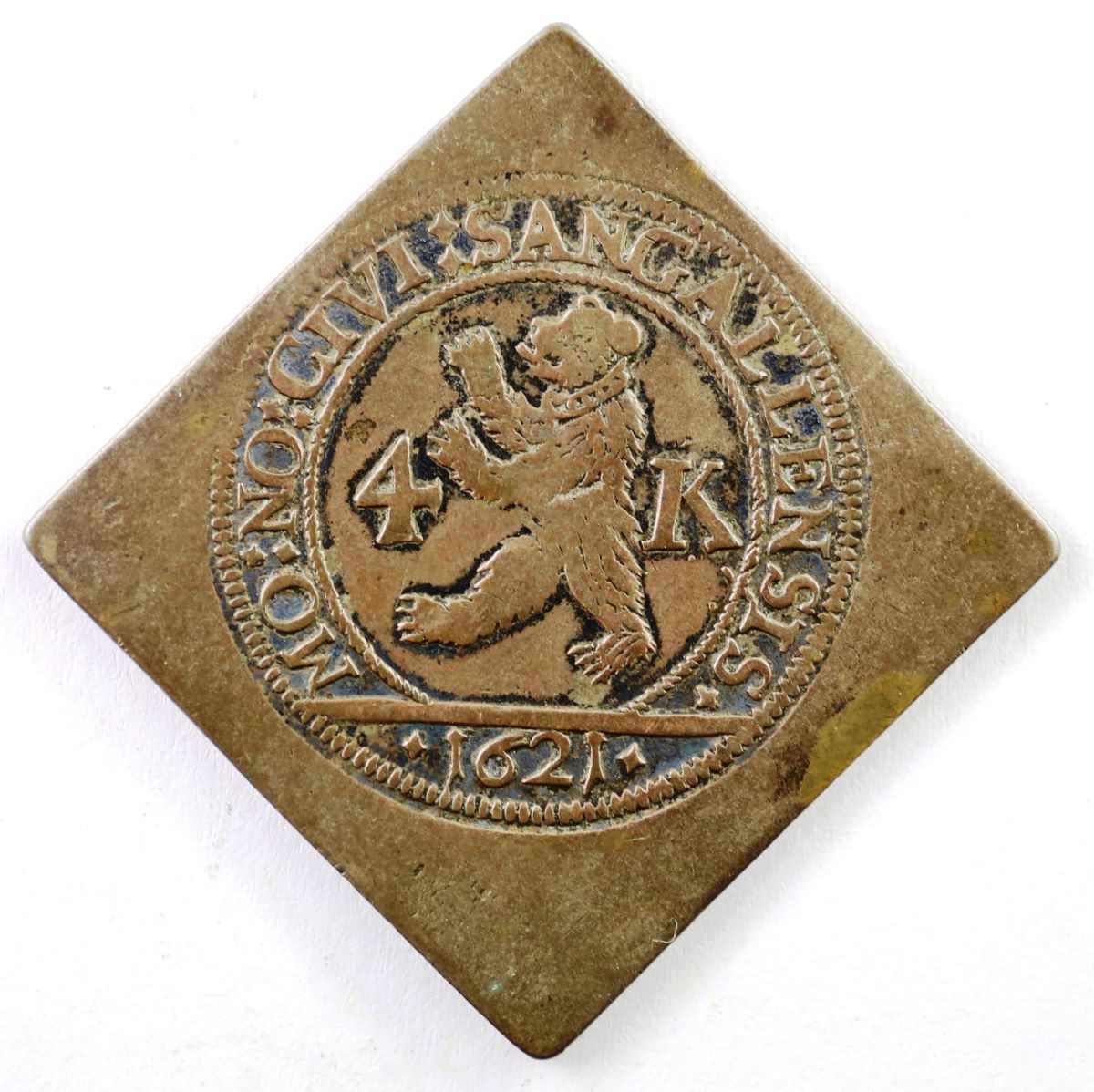 In Strichelkreis Umschrift: «MO : NO : CIVI : SANGALLENSIS» (MONETA NOVA CIVITATIS SANGALLENSIS, neue Münze der Stadt St. Gallen). In Schnurkreis ein aufrecht stehender und heraldisch nach rechts schreitender Bär mit Halsband, flankiert von der Wertangabe «4 – K» (4 Kreuzer), im Abschnitt die Jahreszahl «1621».