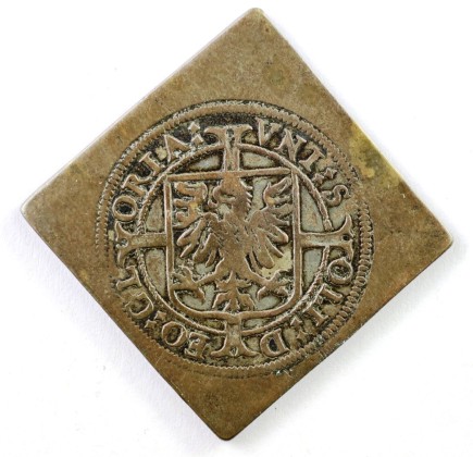 Rs.: In Strichelkreis Umschrift: «VNI : S – OLI : D – EO : GL – ORIA :» (Allein dem einzigen Gott [gebührt] die Ehre). In Schnurkreis Ankerkreuz mit blattförmigen Enden, die Kreuzarme am Wappenschild mit dem Reichsadler ansetzend.