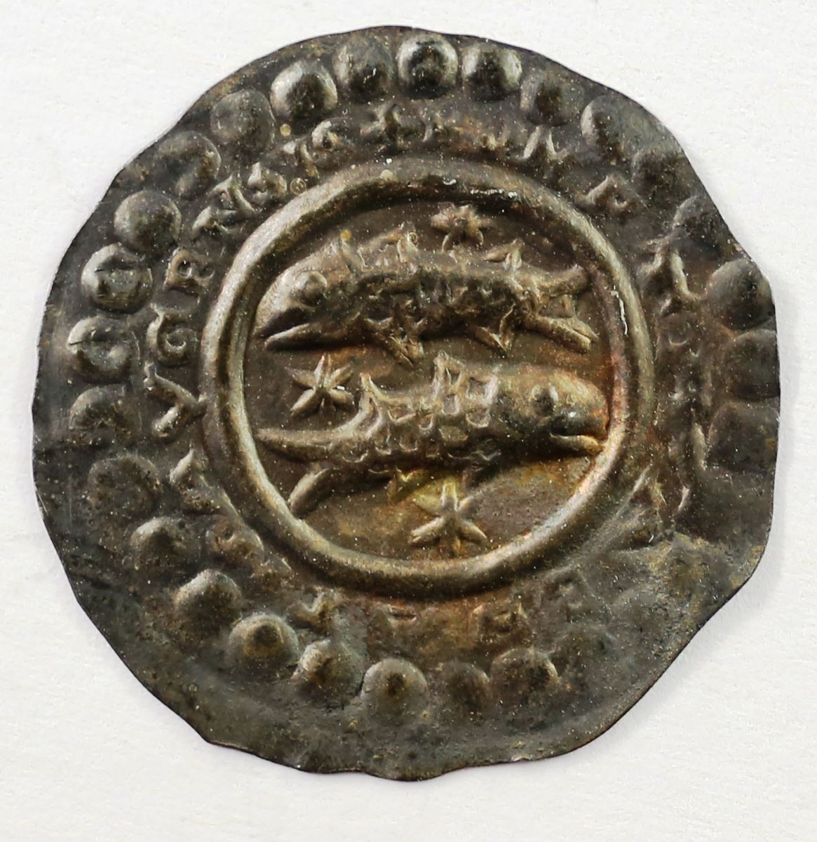 Vs.: Umschrift: «+ MONETA ABBATIS AVGENSIS», (= Münze des Abts der Reichenau). Drei Sterne und zwei gegenläufige Fische in Wulst- und Perlkreis alternierend angeordnet.