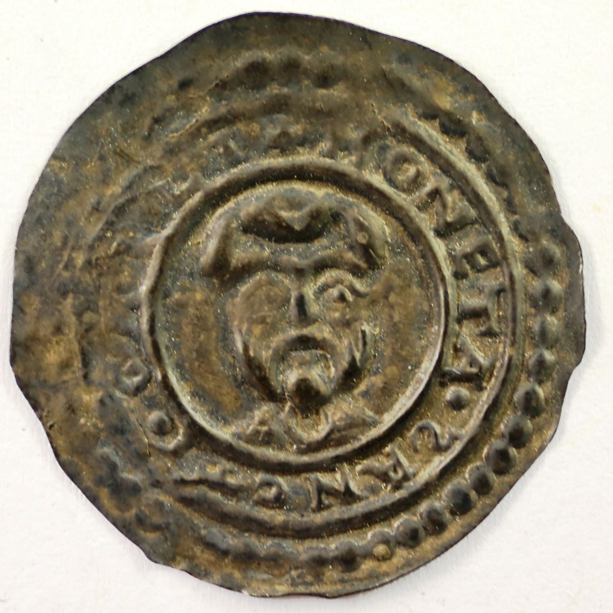 Vs.: Perlkreis Umschrift: «+ MONETA . S[S retrograd]ANCTI . GALLI» (Münze von St. Gallen bzw. des hl. Gallus), zwischen äusserem und innerem Wulstkreis. Im Zentrum tonsurierter und bärtiger Kopf des hl. Gallus bzw. eines Abts.