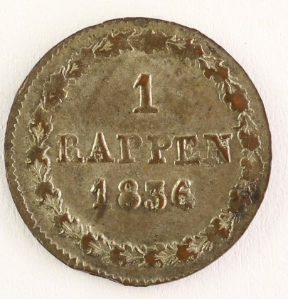 Rs.: In Strichelkreis ein Eichenkranz (Symbole der Stärke, Treue und Einheit), darin die Angaben «1 / RAPPEN / 1836».