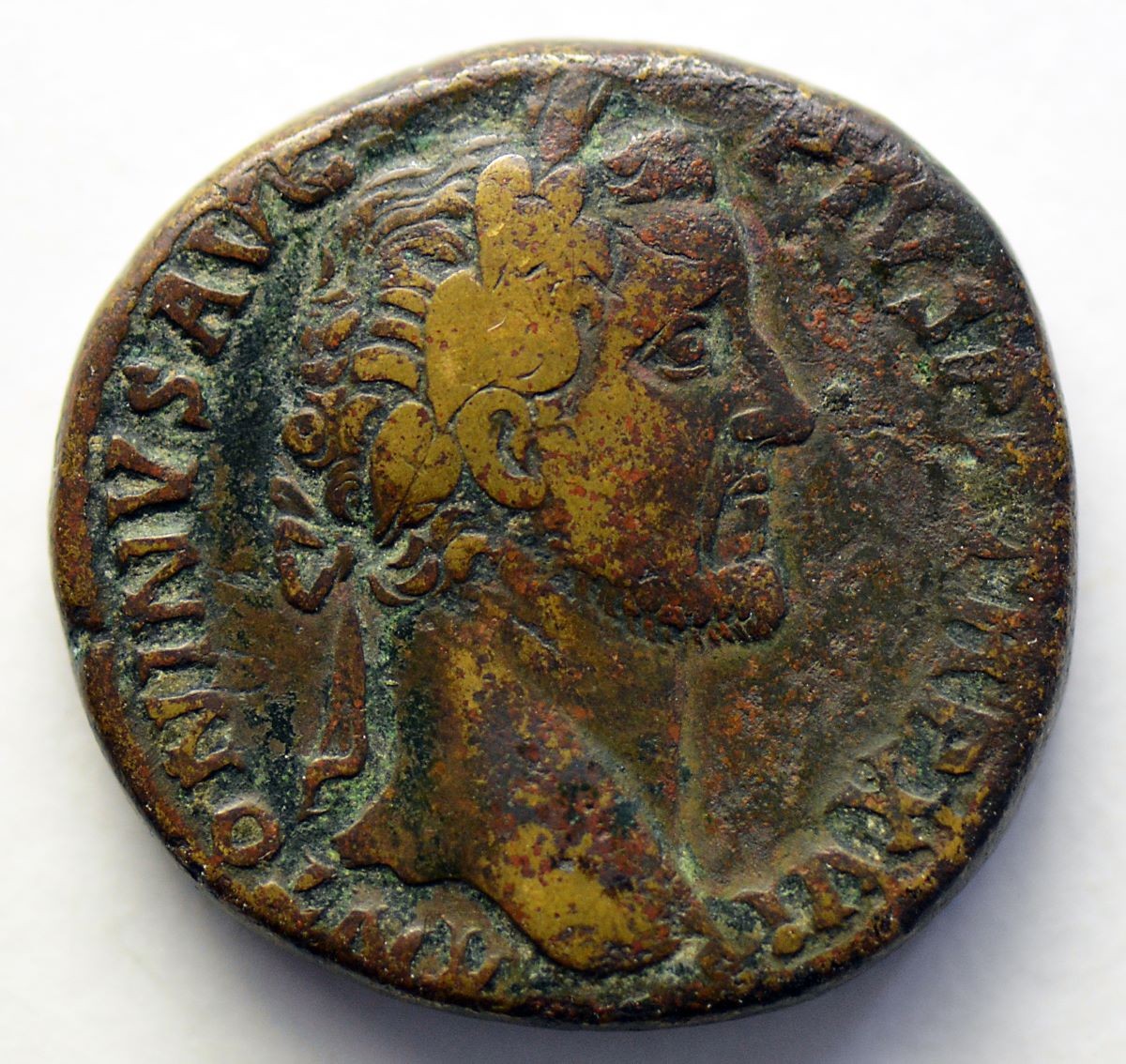 Vs.: Umschrift: «ANTONINVS AVG – PIVS P P TR P XVI». (Antoninus Augustus Pius Pater Patriae Tribunicia Potestate Sexta Decima [zum 16. Mal Volkstribun]). In Linienkreis Kopf von Antoninus Pius mit Lorbeerkranz (Symbol des Siegs und Ruhms) nach rechts.
