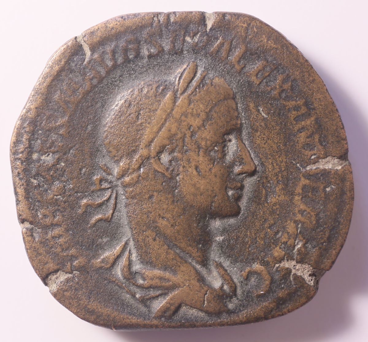 Vs.: Umschrift: «IMP CAES M AVR SEV ALEXANDER AVG» (Imperator Caesar Marcus Aurelius Severus Alexander Augustus). In Linienkreis drapierte Porträtbüste des Kaisers mit Lorbeerkranz (Symbol des Siegs und Ruhms), nach rechts.