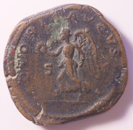 Rs.: Umschrift: «VICTORIA AVGVSTI» (Victoria Augusti). In Perlkreis nach links schreitende Victoria (personifizierte Siegesgöttin, Schutzgöttin des römischen Kaisers), einen Palmzweig (Symbol des Siegs und Friedens) in der Linken und einen Kranz in der Rechten haltend, flankiert von «S – C» (Senatus Consultum) (auf Beschluss des Senats).