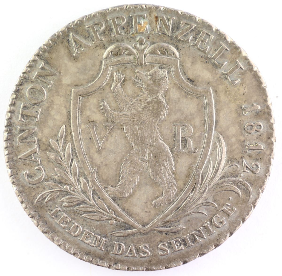 Vs.: In Gerstenkornkreis Umschrift: «CANTON APPENZELL 1812 . – IEDEM DAS SEINIGE .». Spitzer Schild mit Zunge und Bekrönung aus Lilie zwischen Akanthusblättern, darin Wappen von Appenzell Ausserrhoden mit nach links aufrecht schreitendem Bär mit ausgestreckter Zunge und ausgefahrenen Krallen, flankiert von «V – R» (UR für Ussroden), Schild zwischen Lorbeer- und Palmzweig (Symbole des Siegs und Ruhms sowie des Friedens).