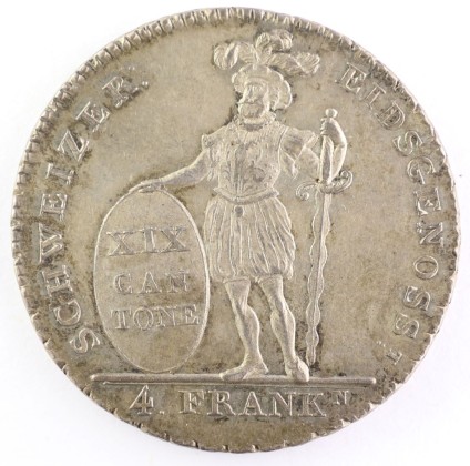 Rs.: In Gerstenkornkreis Umschrift: «SCHWEIZER[ISCHE] : – EIDSGENOSS[ENSCHAF]T[T hochgestellt] :». Auf Bodenleiste stehender Krieger nach links blickend, in «altschweizerisch-vaterländischer Tracht» in Anlehnung an die Söldnerkleidung des 16. Jhs. mit geschlitzten Beinkleidern, geschlitztem Wams, Radkragen und Federhut (Freiheitshut, Symbol für die Freiheit). In seiner linken Hand den Griff eines Zweihänder-Langschwerts mit geflammter Klinge und gebogener Parierstange (Symbol der Wehrhaftigkeit und militärischen Stärke) haltend. Mit der Rechten einen ovalen Schild präsentierend, darauf die Inschrift «XIX / CAN : / TONE» (19 Kantone), unter Bodenleiste die Wertangabe «4 . FRANKN[N hochgestellt] :».