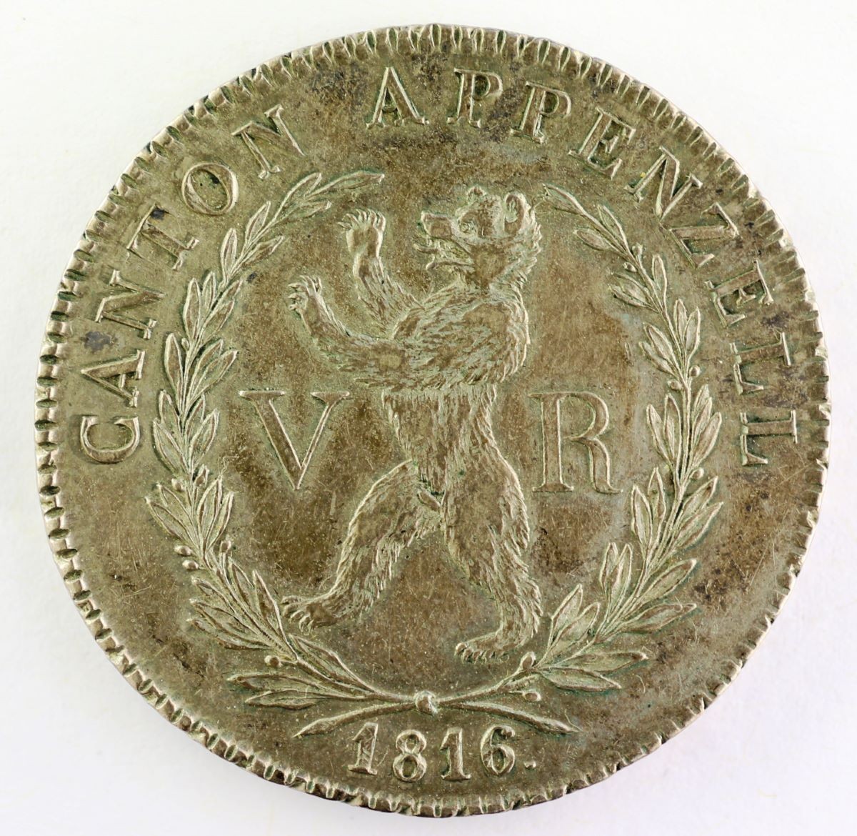 Vs.: In Strichelkreis Umschrift: «CANTON APPENZELL – 1816 .». In aus zwei Zweigen geformtem Lorbeerkranz (Symbol des Siegs und Ruhms) nach links aufrecht schreitender Bär mit ausgerollter Zunge und ausgefahrenen Krallen, flankiert von «V – R» (UR für Ussroden).